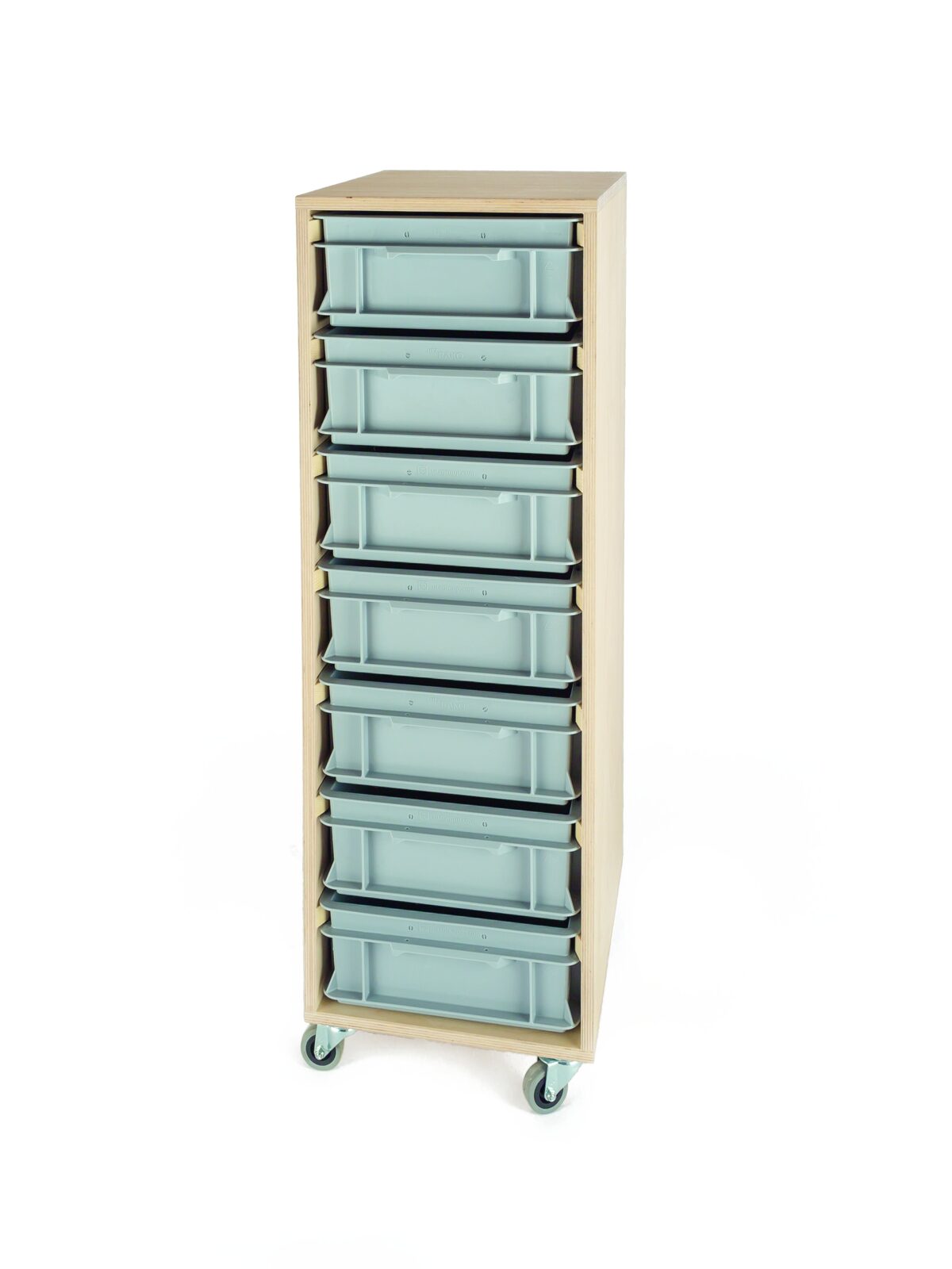 Schubladenkorpus Buche, Naturlack mit 1 x 7 Boxen aus Multiplex transparent, auf Möbelrollen mit zwei Feststellern.